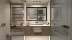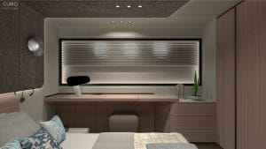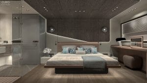 Master kabinin merkezinde yer alan geniş yatak, modern hatları ve yatak başından tavana uzanan stingray görünümlü panel ile dikkat çekiyor. Beyaz deri üzerine, doku zenginliği oluşturan akıcı materyaller ve modern aydınlatma ürünleri, kabin içinde huzurlu bir atmosfer yaratıyor. Entegre banyo tasarımı, şık cam bölme ile ayrılmış olup, oda ile organik bir bütünlük içinde modern lüksün ve fonksiyonelliğin mükemmel bir örneğini sunuyor. Ayrıca, yatak yanında konumlanmış makyaj masası, fonksiyonel detaylarla konforu sürdürülebilir kılıyor.