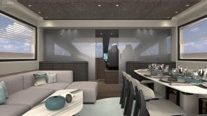Teknenin salonundaki zarif ve modern oturma grupları, konuklara rahatlıkla vakit geçirebilecekleri bir ortam sunuyor. İnce dokunuşlarla tasarlanmış salon, denizin sonsuz maviliğine açılan panoramik camlarla aydınlık ve ferah bir atmosfer sağlıyor. Modern tasarımı ve fonksiyonelliği ile öne çıkan yemek masası, denizin ortasında birinci sınıf bir yemek deneyimi yaşatmak üzere itina ile tasarlanmıştır. Pilot house, bir separatörle salon bölümünden zarifçe ayrılarak navigasyon ve mürettebat işlevlerinin misafir alanlarından ayrılmasını sağlıyor. İleri teknoloji ile donatılmış pilot house, manevra kabiliyeti ve seyir kolaylığı sunmak üzere modern ve ergonomik bir düzene sahip.