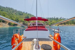 Göcek Limanı’ndan hareket eden ve Göcek koylarında seyir halinde olan teknemiz, 2 personel eşliğinde hizmet vermektedir. Teknemize giriş saati 14:00 olup, çıkış saatlerinde son gece çıkışının sabahı 09:30’dur.
